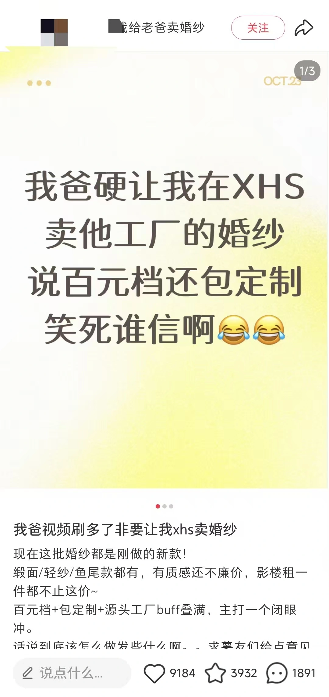 • 我们看下面这个卖婚纱的笔记,我爸硬让我在小红书卖他工厂的婚纱,