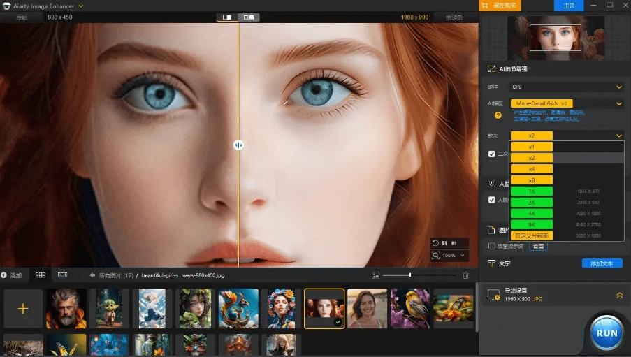• 能够将低分辨率图像提升至 4K、8K 甚至 16K 的高清分辨率